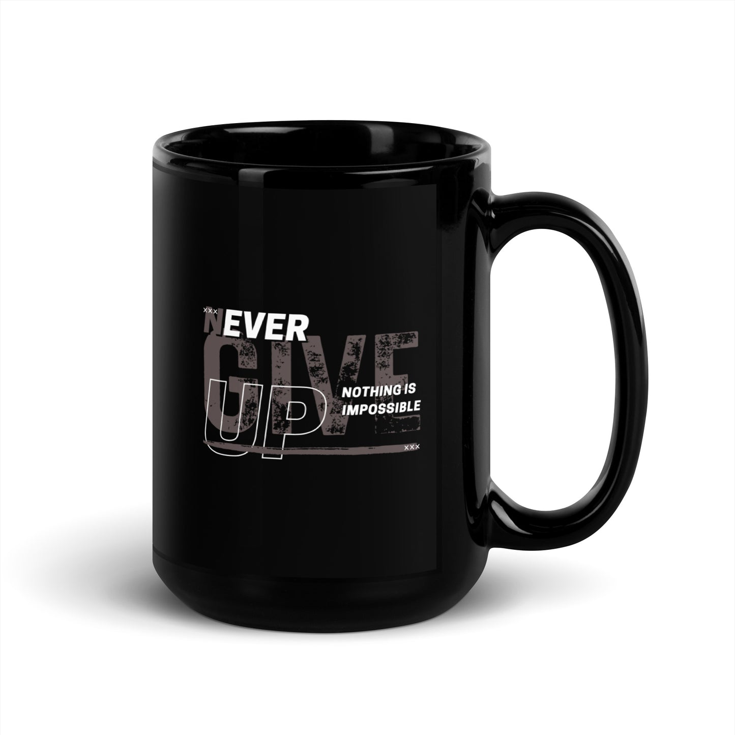 Never Ever Give Up Nothing Is Impossible Black Glossy Mug 15 oz. | Right Handed